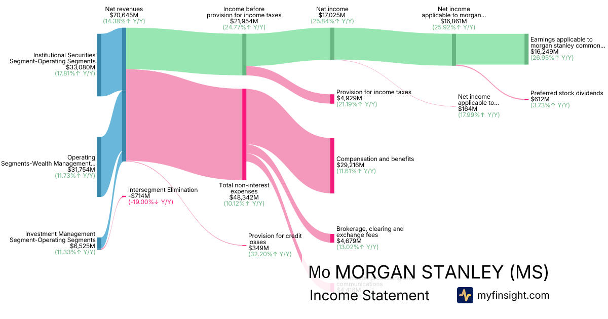 For the year ending 2025-12-31, MS made $70,645M in revenue. $16,249M in net income. Net profit margin of 23.00%.