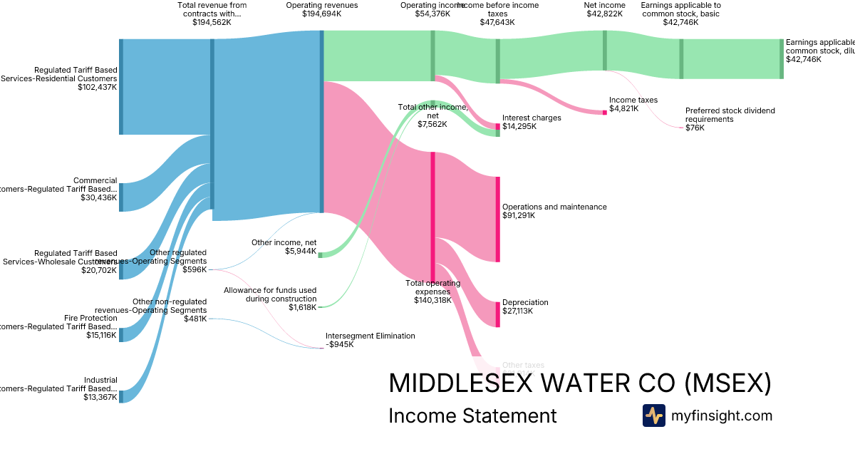 For the year ending 2025-12-31, MSEX made $194,694K in revenue. $42,746K in net income. Net profit margin of 21.96%.