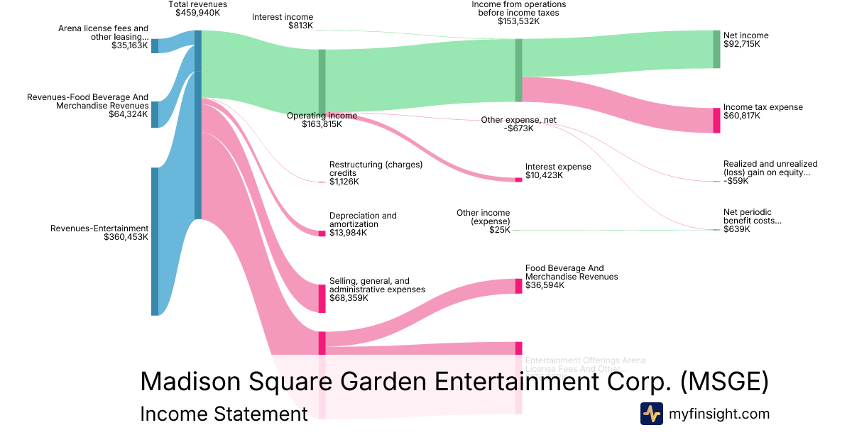 For the quarter ending 2025-12-31, MSGE made $459,940K in revenue. $92,715K in net income. Net profit margin of 20.16%.