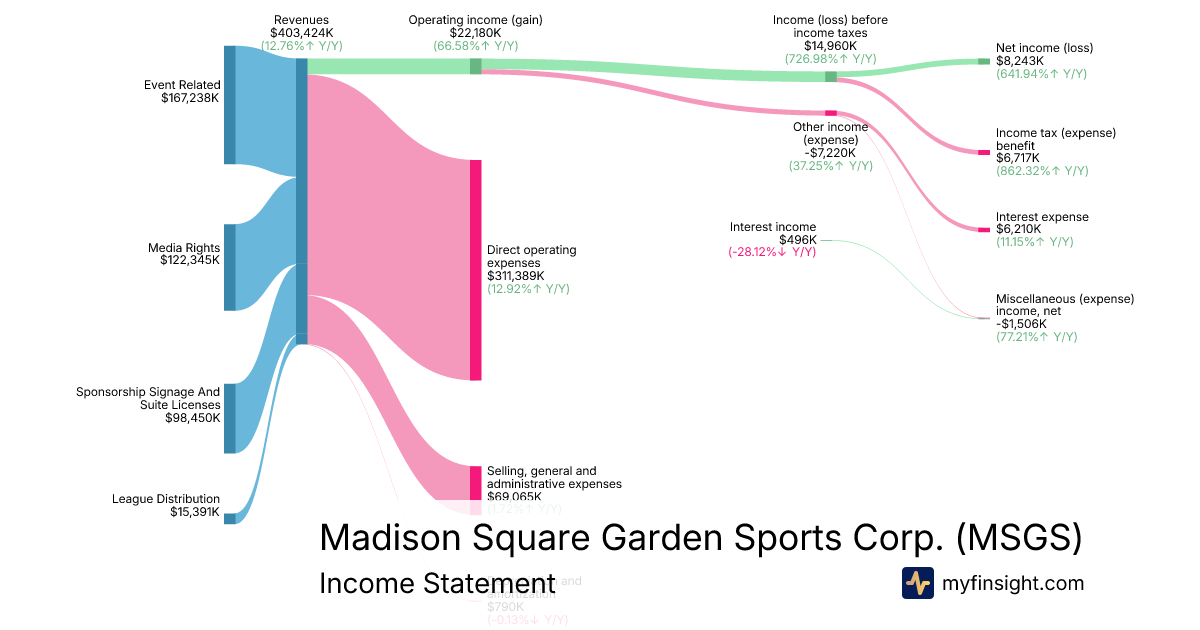 For the quarter ending 2025-12-31, MSGS made $403,424K in revenue. $8,243K in net income. Net profit margin of 2.04%.