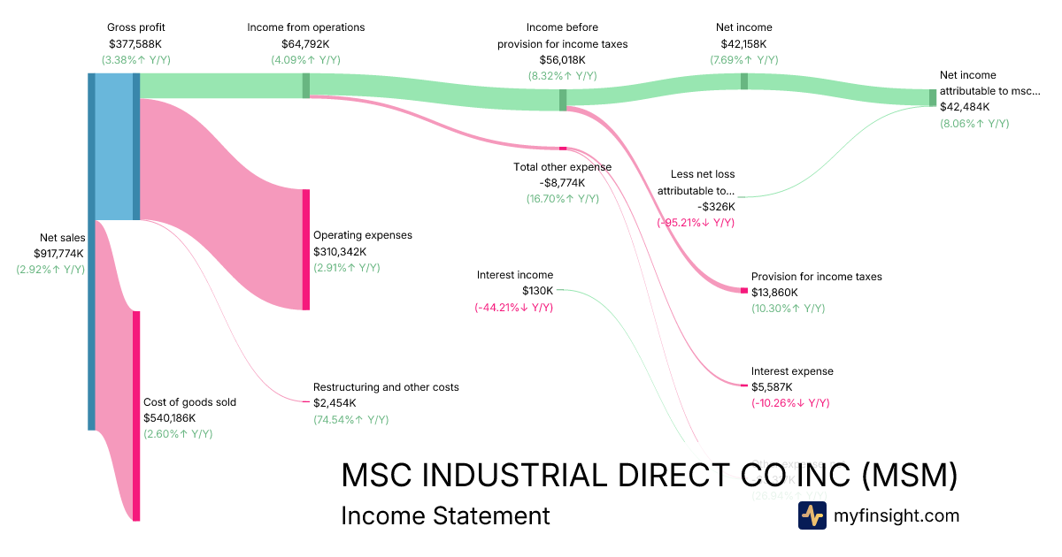 For the quarter ending 2026-02-28, MSM made $917,774K in revenue. $42,484K in net income. Net profit margin of 4.63%.