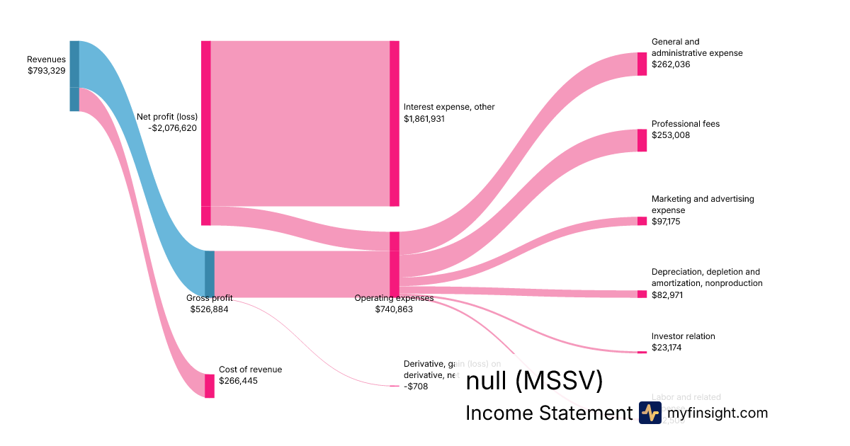 For the quarter ending 2024-06-30, MSSV made $793,329 in revenue. -$2,076,620 in net income. Net profit margin of -261.76%.