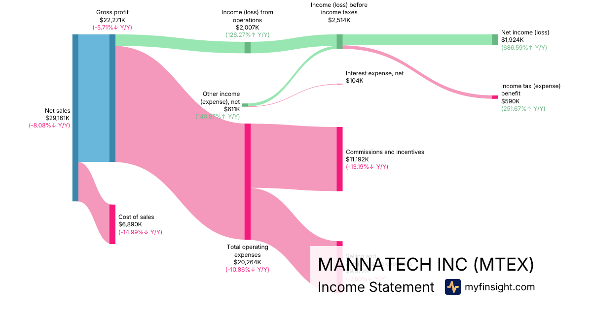 For the quarter ending 2025-09-30, MTEX made $29,161K in revenue. $1,924K in net income. Net profit margin of 6.60%.