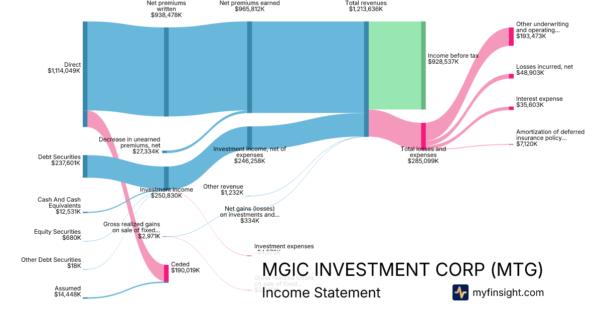 For the year ending 2025-12-31, MTG made $1,213,636K in revenue. $928,537K in net income. Net profit margin of 76.51%.