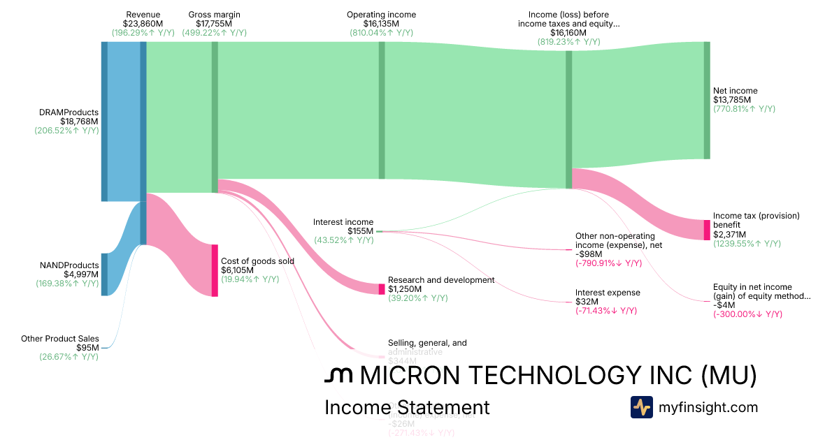 For the quarter ending 2026-02-26, MU made $23,860M in revenue. $13,785M in net income. Net profit margin of 57.77%.