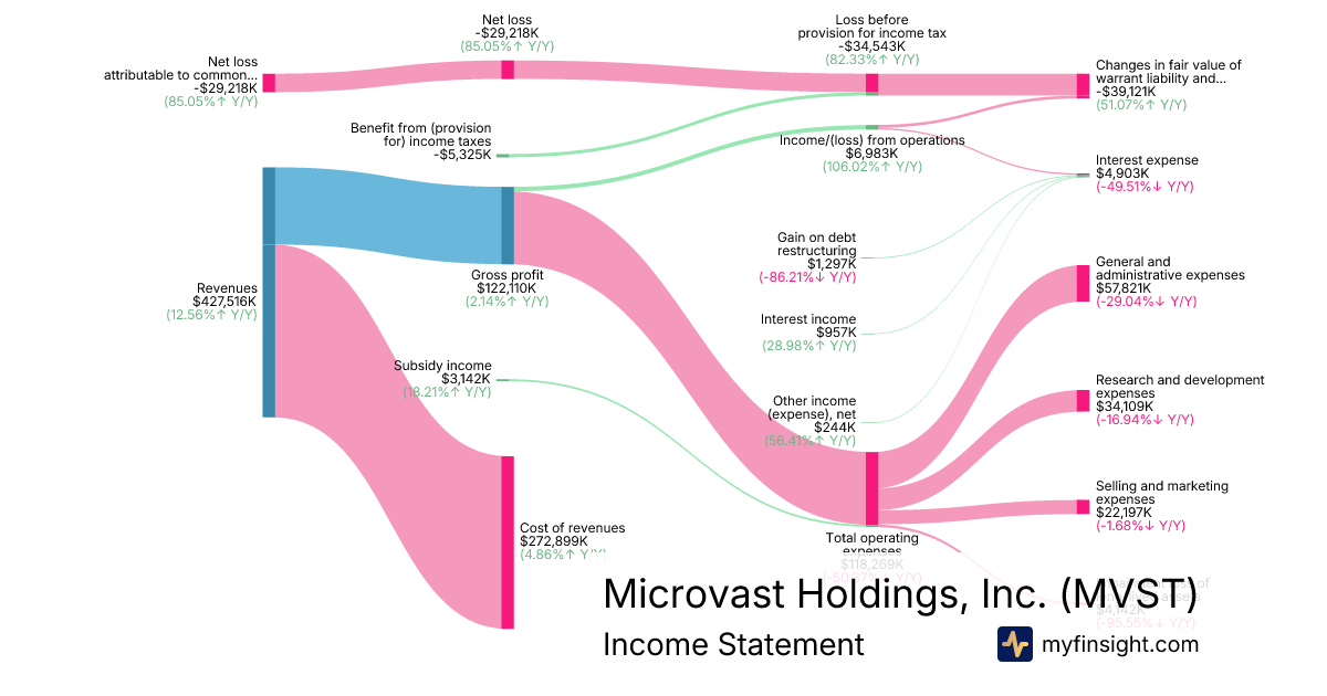For the year ending 2025-12-31, MVST made $427,516K in revenue. -$29,218K in net income. Net profit margin of -6.83%.
