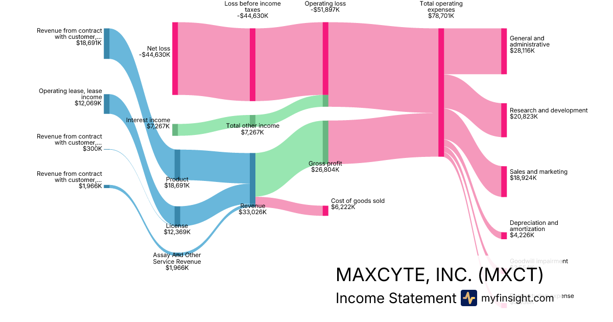 For the year ending 2025-12-31, MXCT made $33,026K in revenue. -$44,630K in net income. Net profit margin of -135.14%.