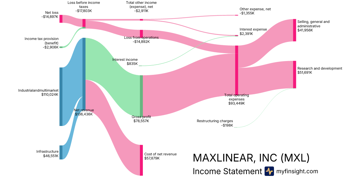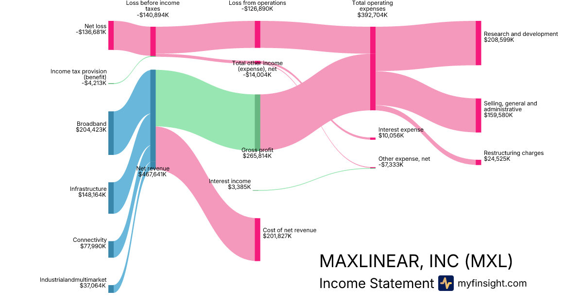 For the year ending 2025-12-31, MXL made $467,641K in revenue. -$136,681K in net income. Net profit margin of -29.23%.