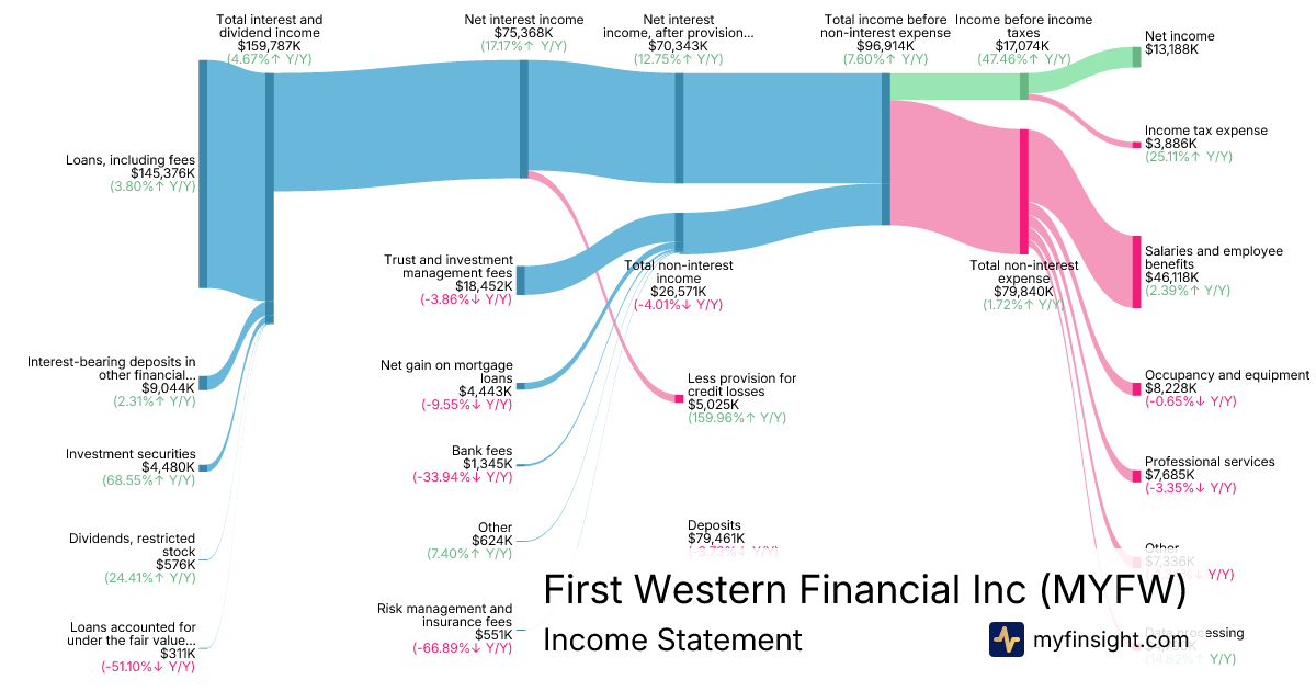 For the year ending 2025-12-31, MYFW made $96,914K in revenue. $13,188K in net income. Net profit margin of 13.61%.