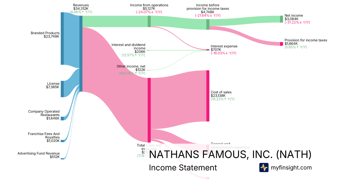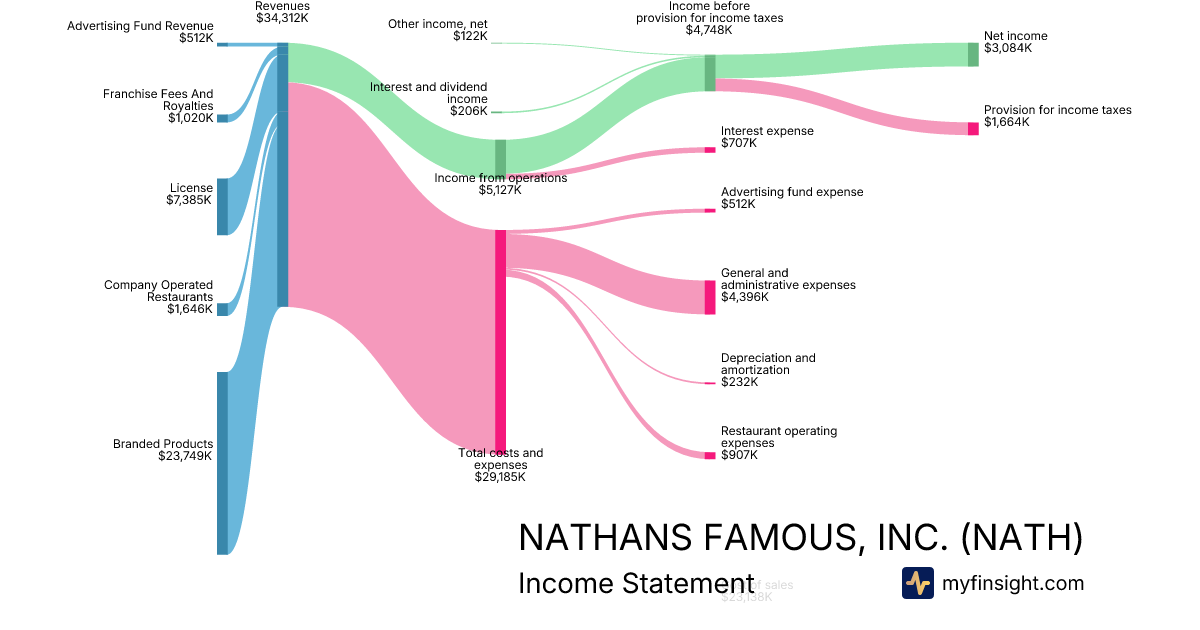 For the quarter ending 2025-12-28, NATH made $34,312K in revenue. $3,084K in net income. Net profit margin of 8.99%.