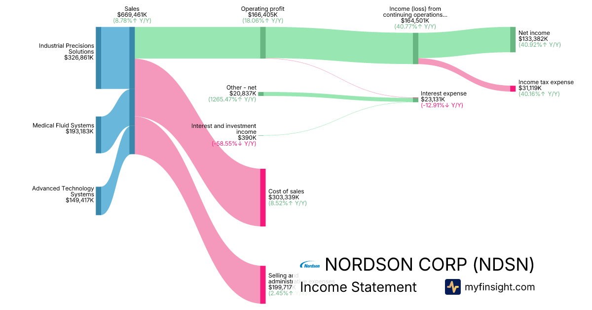 For the quarter ending 2026-01-31, NDSN made $669,461K in revenue. $133,382K in net income. Net profit margin of 19.92%.