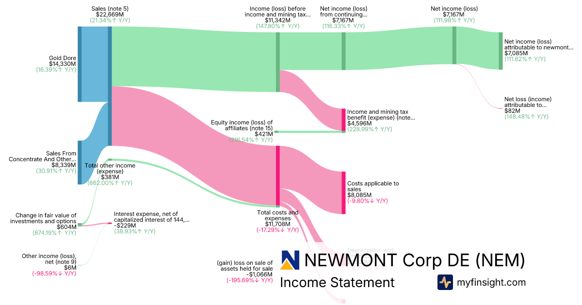 For the year ending 2025-12-31, NEM made $22,669M in revenue. $7,085M in net income. Net profit margin of 31.25%.