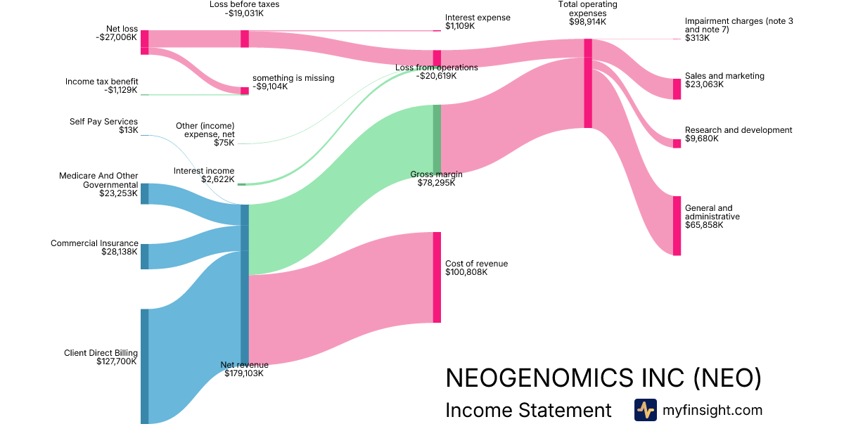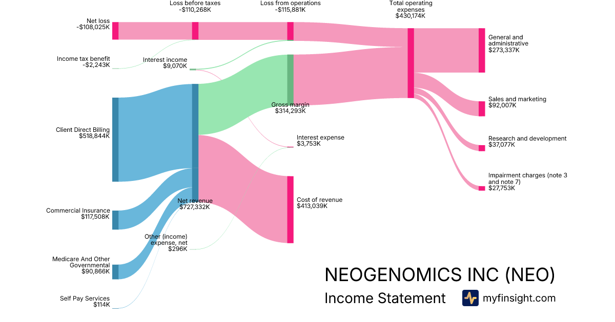 For the year ending 2025-12-31, NEO made $727,332K in revenue. -$108,025K in net income. Net profit margin of -14.85%.
