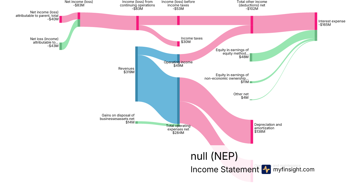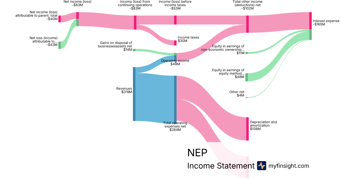 For the quarter ending 2024-09-30, NEP made $319M in revenue. -$40M in net income. Net profit margin of -12.54%.