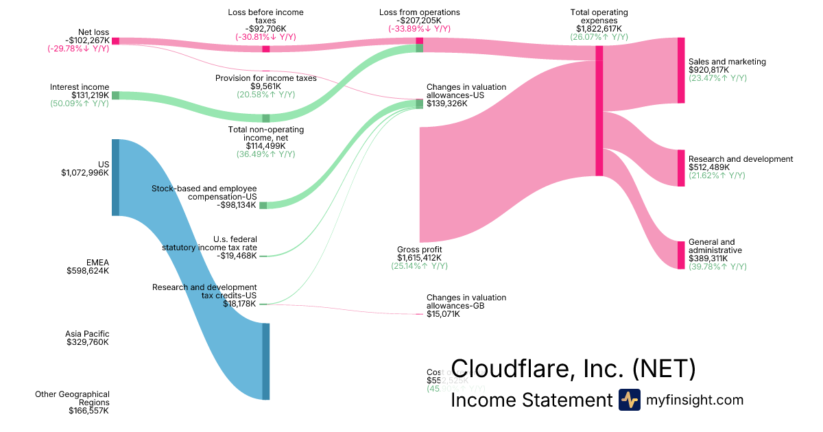 For the year ending 2025-12-31, NET made $2,167,937K in revenue. -$102,267K in net income. Net profit margin of -4.72%.