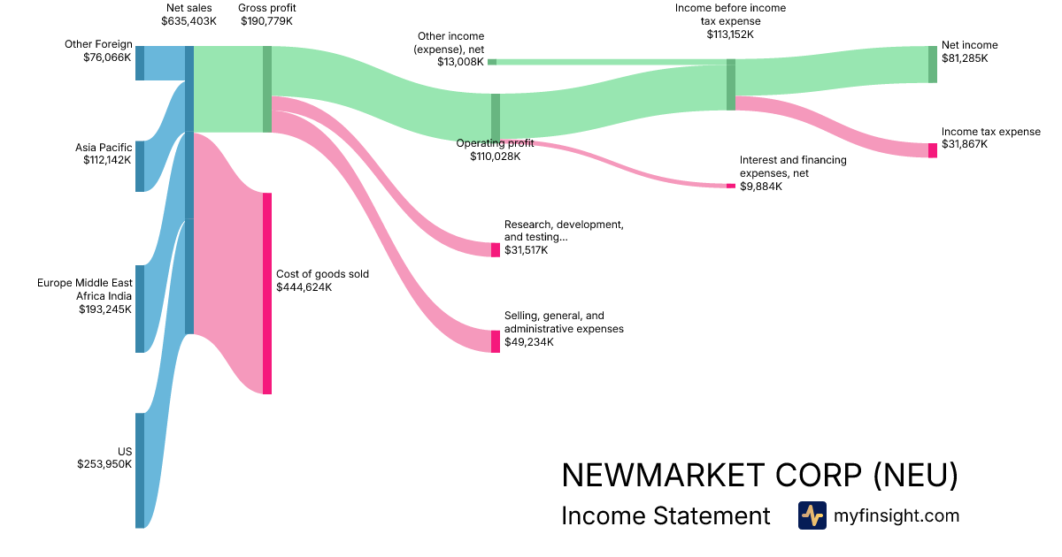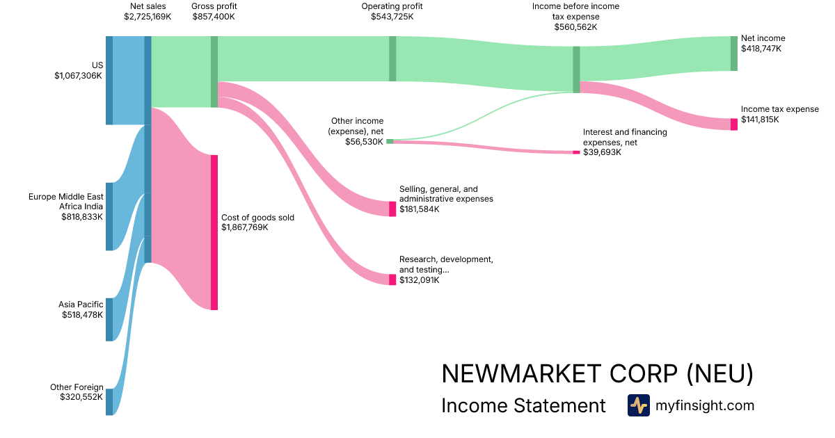 For the year ending 2025-12-31, NEU made $2,725,169K in revenue. $418,747K in net income. Net profit margin of 15.37%.