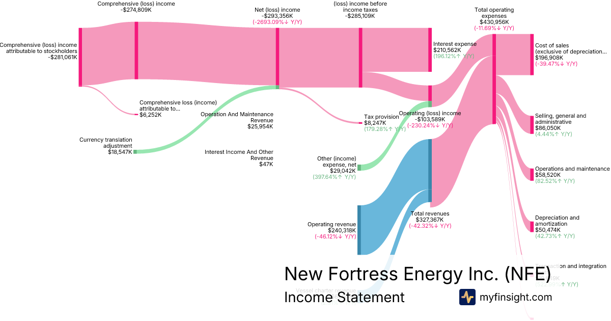 For the quarter ending 2025-09-30, NFE made $327,367K in revenue. -$281,061K in net income. Net profit margin of -85.86%.