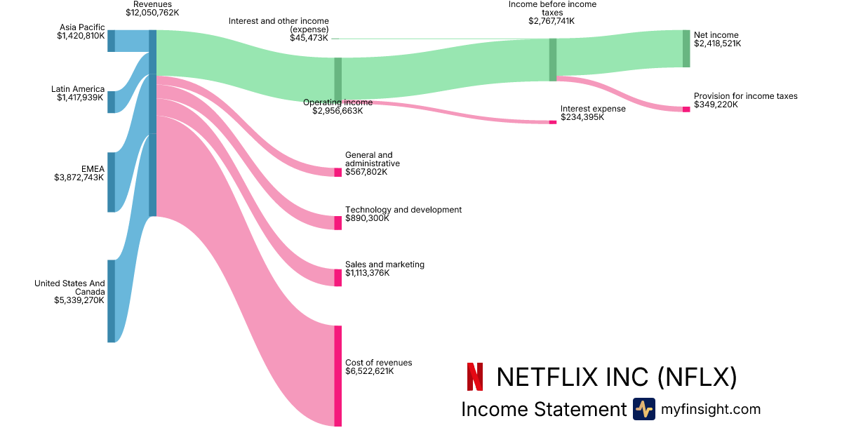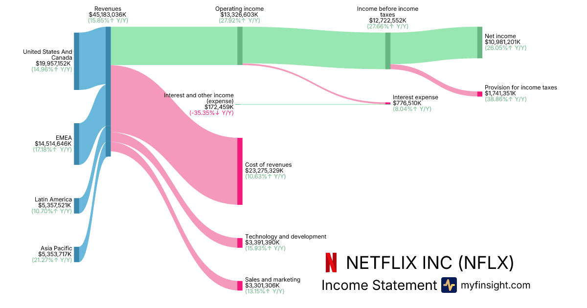 For the year ending 2025-12-31, NFLX made $45,183,036K in revenue. $10,981,201K in net income. Net profit margin of 24.30%.