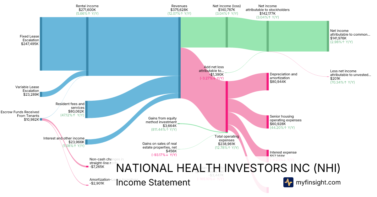 For the year ending 2025-12-31, NHI made $375,628K in revenue. $141,976K in net income. Net profit margin of 37.80%.