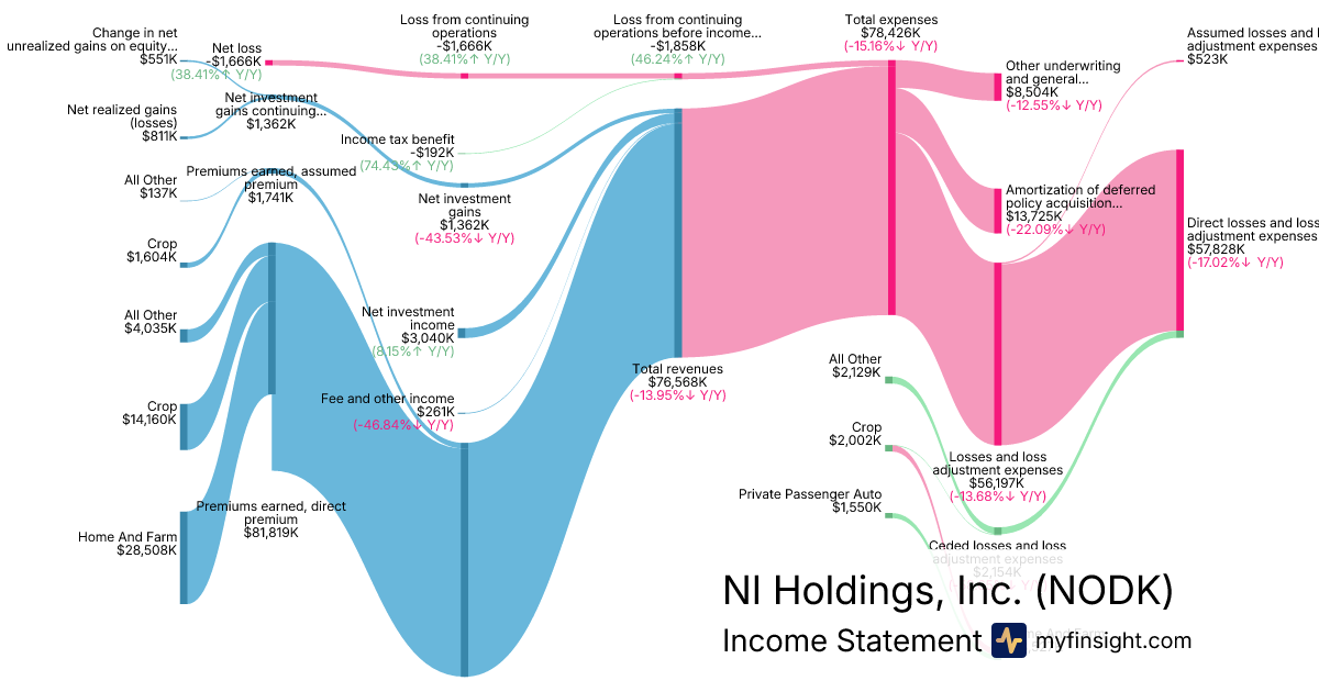 For the quarter ending 2025-09-30, NODK made $76,568K in revenue. -$1,666K in net income. Net profit margin of -2.18%.