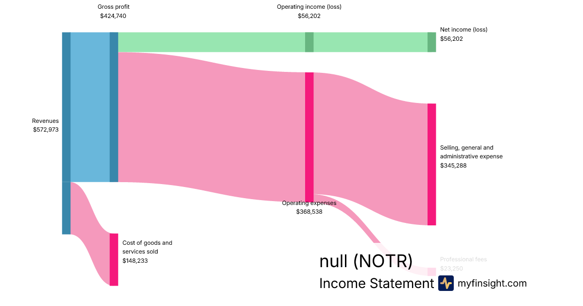 For the quarter ending 2024-09-30, NOTR made $572,973 in revenue. $56,202 in net income. Net profit margin of 9.81%.