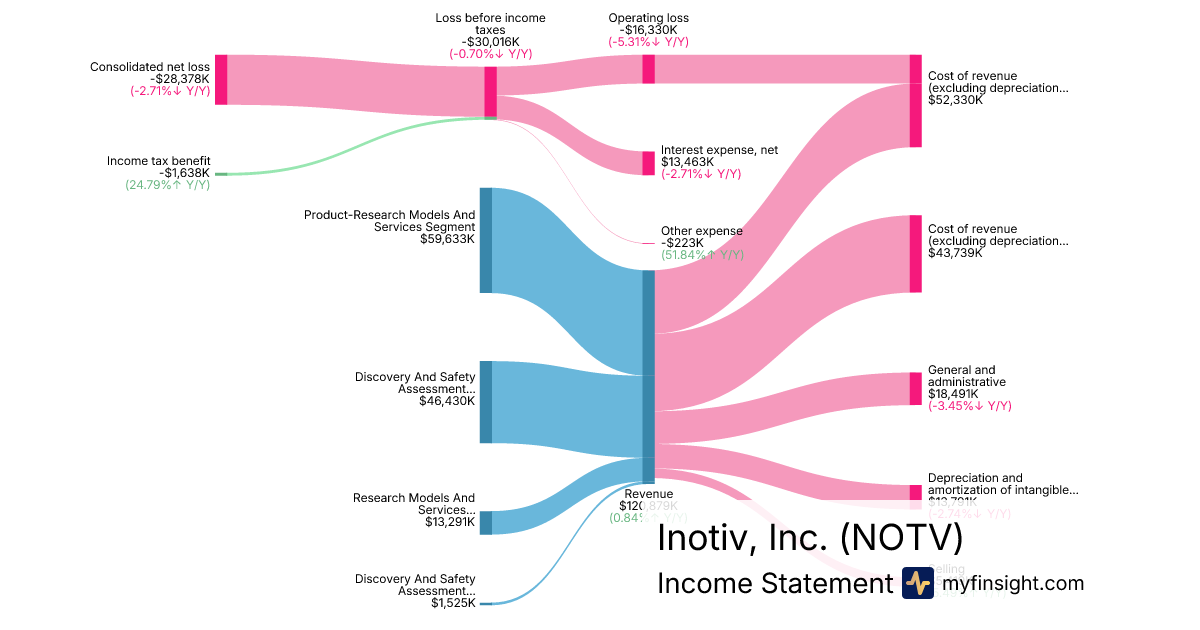 For the quarter ending 2025-12-31, NOTV made $120,879K in revenue. -$28,378K in net income. Net profit margin of -23.48%.