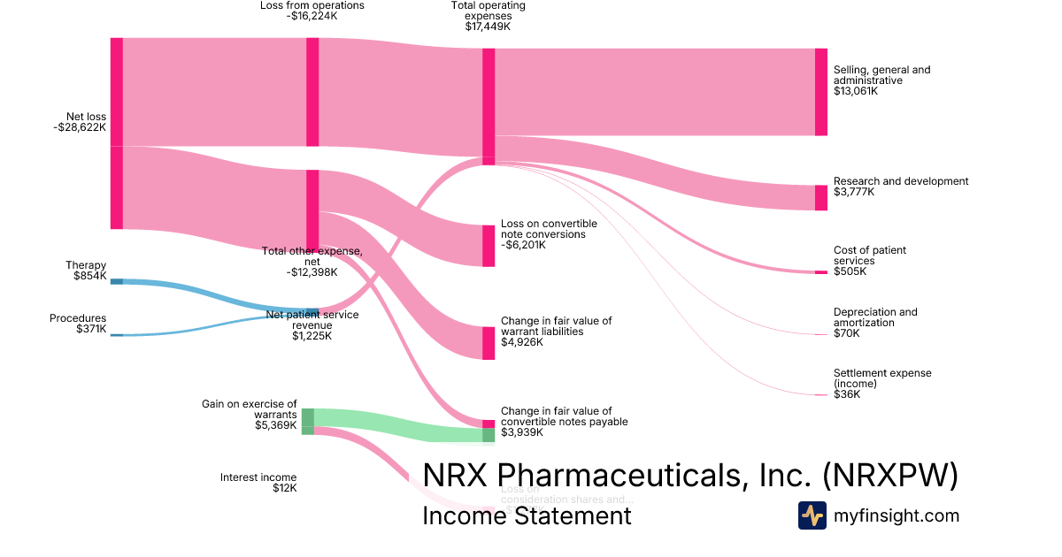 For the year ending 2025-12-31, NRXPW made $1,225K in revenue. -$28,622K in net income. Net profit margin of -2336.49%.