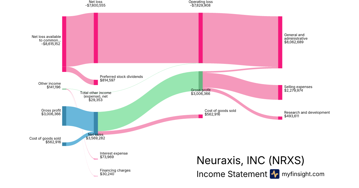 For the year ending 2025-12-31, NRXS made $3,569,282 in revenue. -$8,615,152 in net income. Net profit margin of -241.37%.