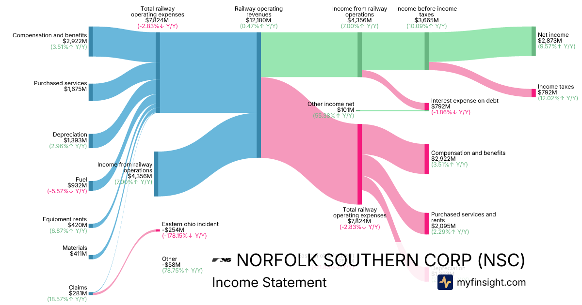 For the year ending 2025-12-31, NSC made $12,180M in revenue. $2,873M in net income. Net profit margin of 23.59%.