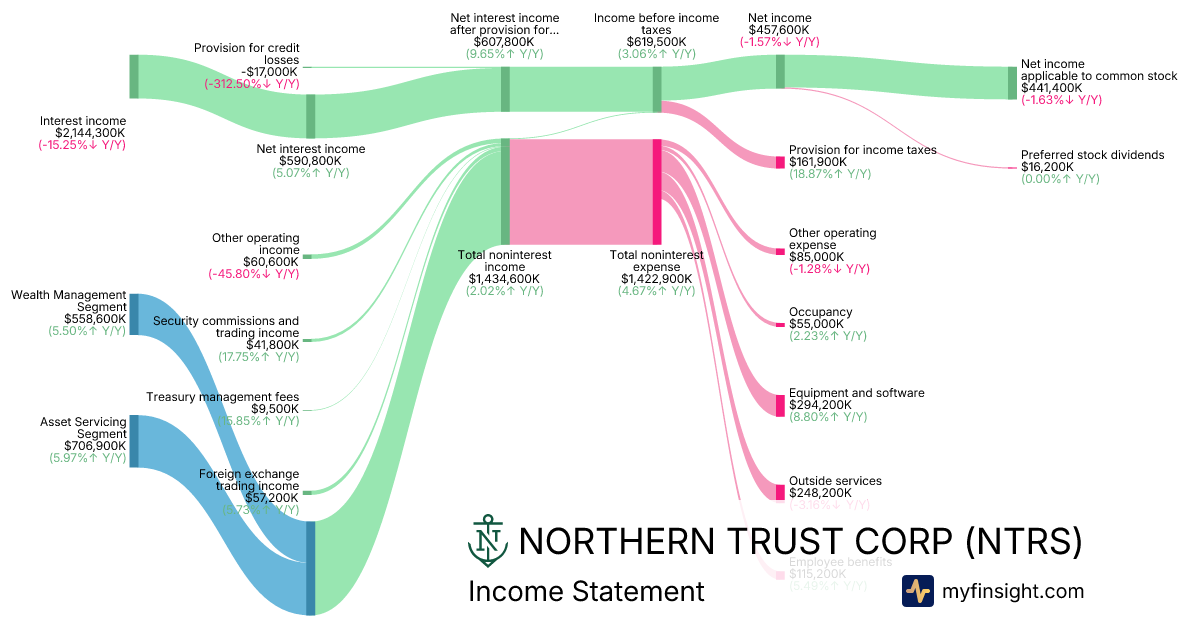 For the quarter ending 2025-09-30, NTRS made $1,265,500K in revenue. $441,400K in net income. Net profit margin of 34.88%.