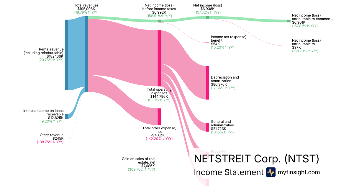 For the year ending 2025-12-31, NTST made $195,006K in revenue. $6,901K in net income. Net profit margin of 3.54%.