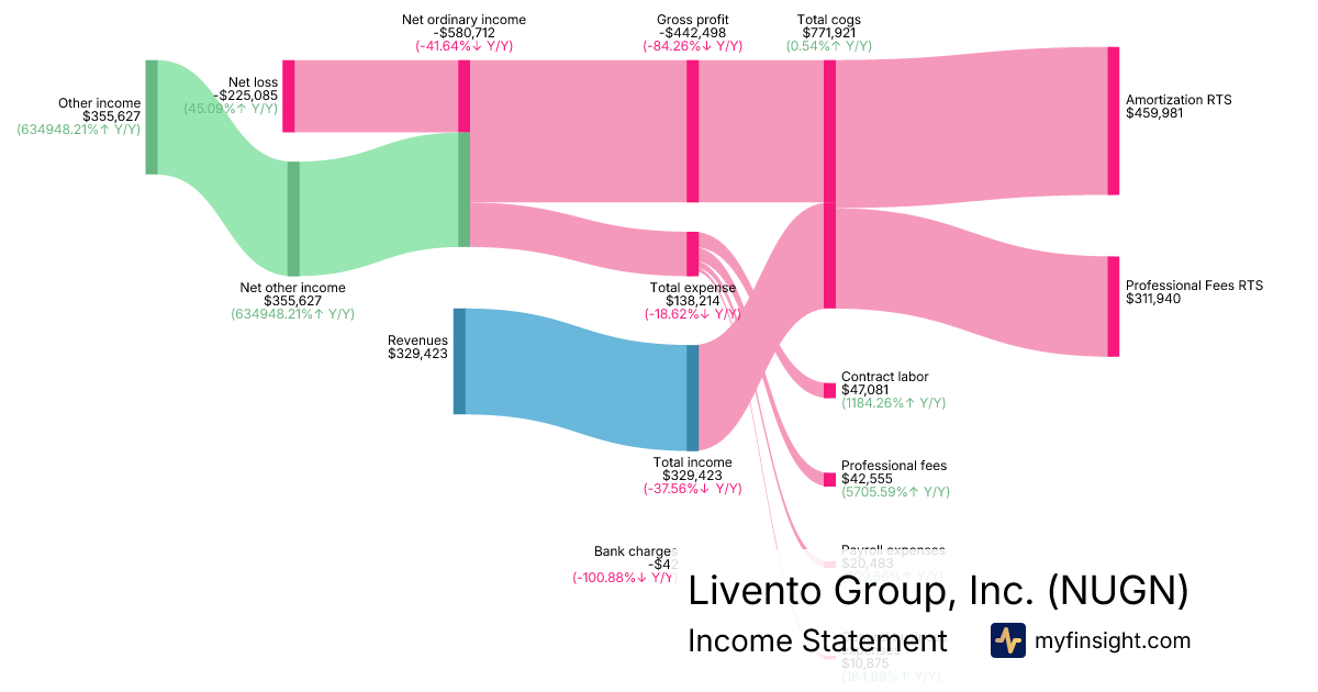 For the quarter ending 2025-09-30, NUGN made $329,423 in revenue. -$225,085 in net income. Net profit margin of -68.33%.
