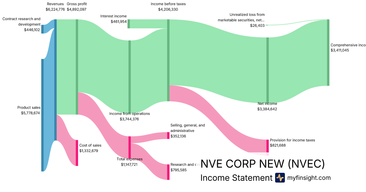For the quarter ending 2025-12-31, NVEC made $6,224,776 in revenue. $3,411,045 in net income. Net profit margin of 54.80%.