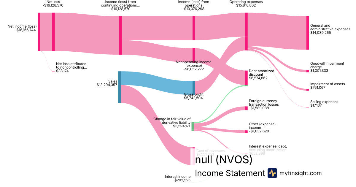 For the year ending 2024-08-31, NVOS made $13,294,357 in revenue. -$16,166,744 in net income. Net profit margin of -121.61%.