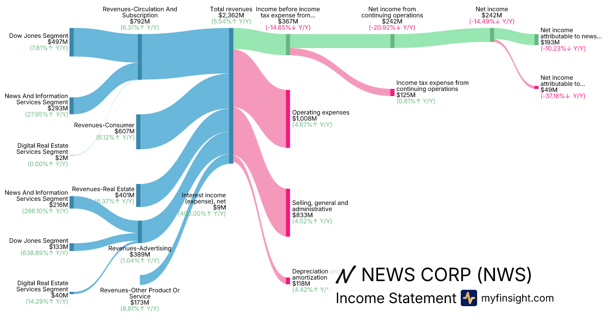 For the quarter ending 2025-12-31, NWS made $2,362M in revenue. $193M in net income. Net profit margin of 8.17%.