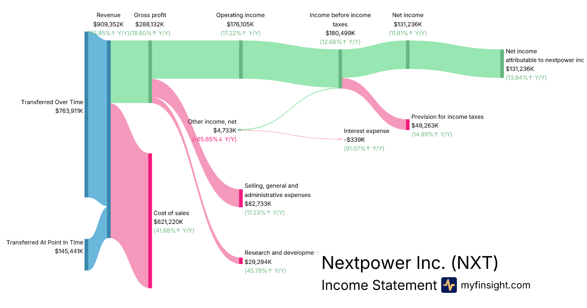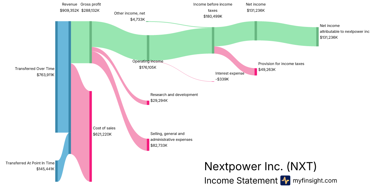 For the quarter ending 2025-12-31, NXT made $909,352K in revenue. $131,236K in net income. Net profit margin of 14.43%.
