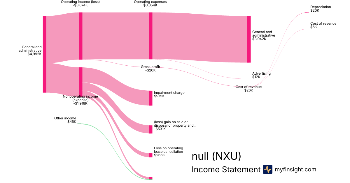For the quarter ending 2024-09-30, NXU made $6K in revenue. -$4,992K in net income. Net profit margin of -83200.00%.