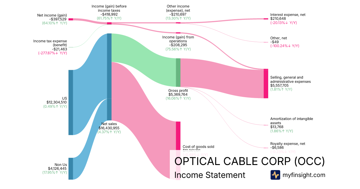 For the quarter ending 2026-01-31, OCC made $16,430,955 in revenue. -$397,529 in net income. Net profit margin of -2.42%.