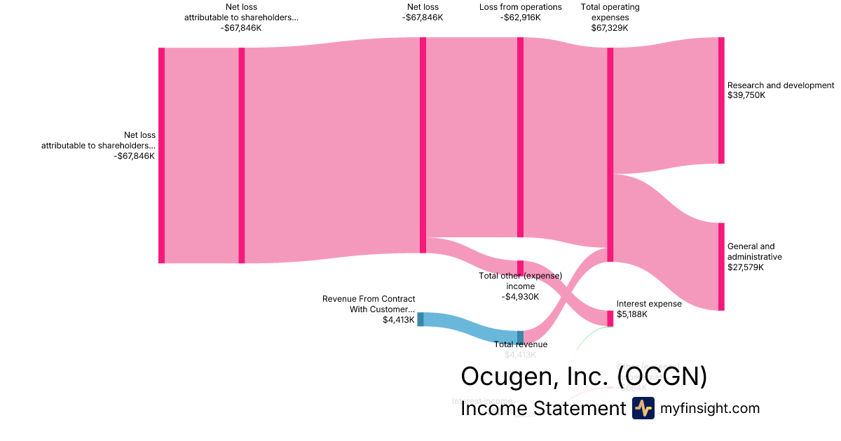 For the year ending 2025-12-31, OCGN made $4,413K in revenue. -$67,846K in net income. Net profit margin of -1537.41%.