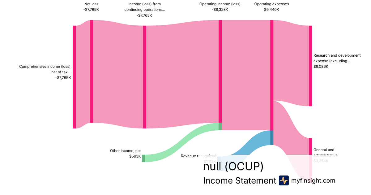 For the quarter ending 2024-06-30, OCUP made $1,112K in revenue. -$7,765K in net income. Net profit margin of -698.29%.