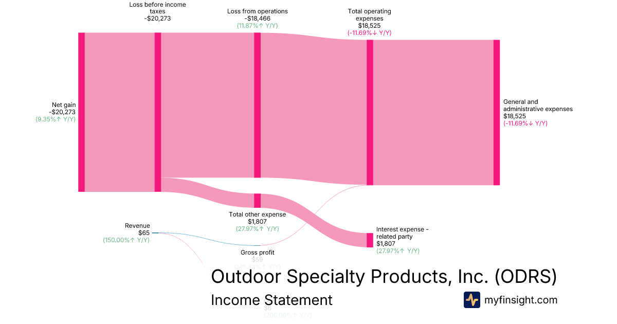 For the quarter ending 2025-12-31, ODRS made $65 in revenue. -$20,273 in net income. Net profit margin of -31189.23%.
