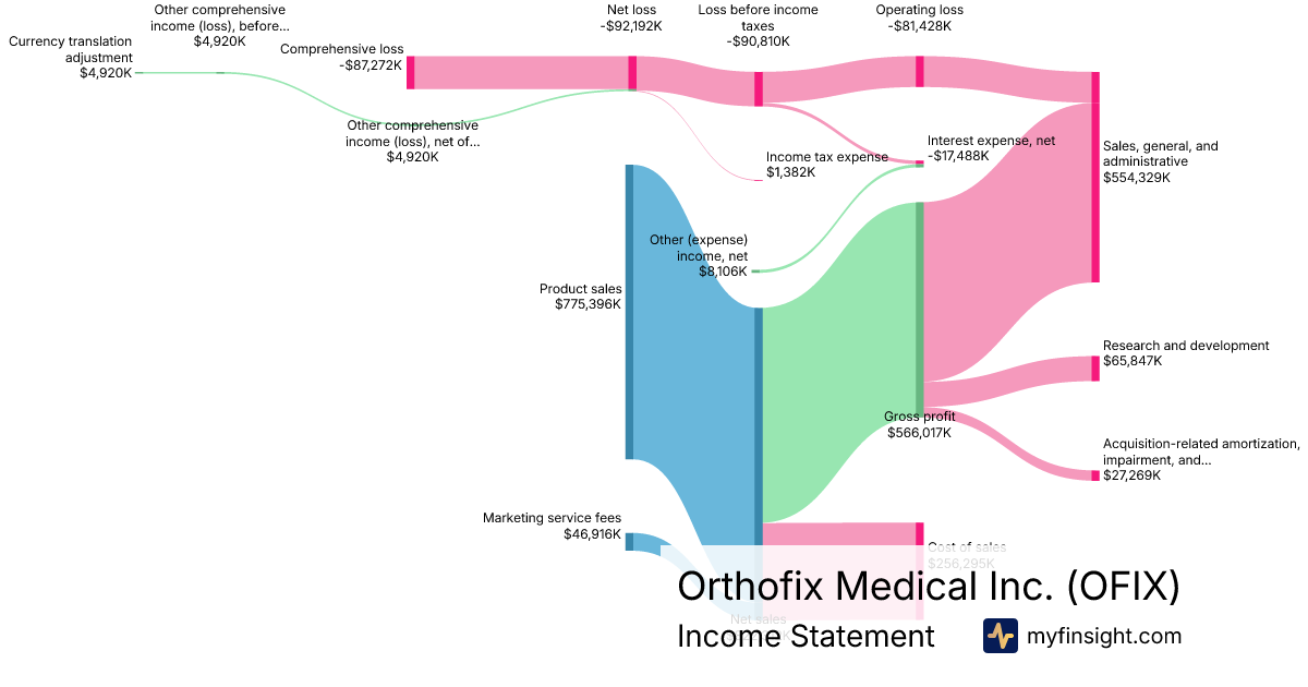 For the year ending 2025-12-31, OFIX made $822,312K in revenue. -$87,272K in net income. Net profit margin of -10.61%.