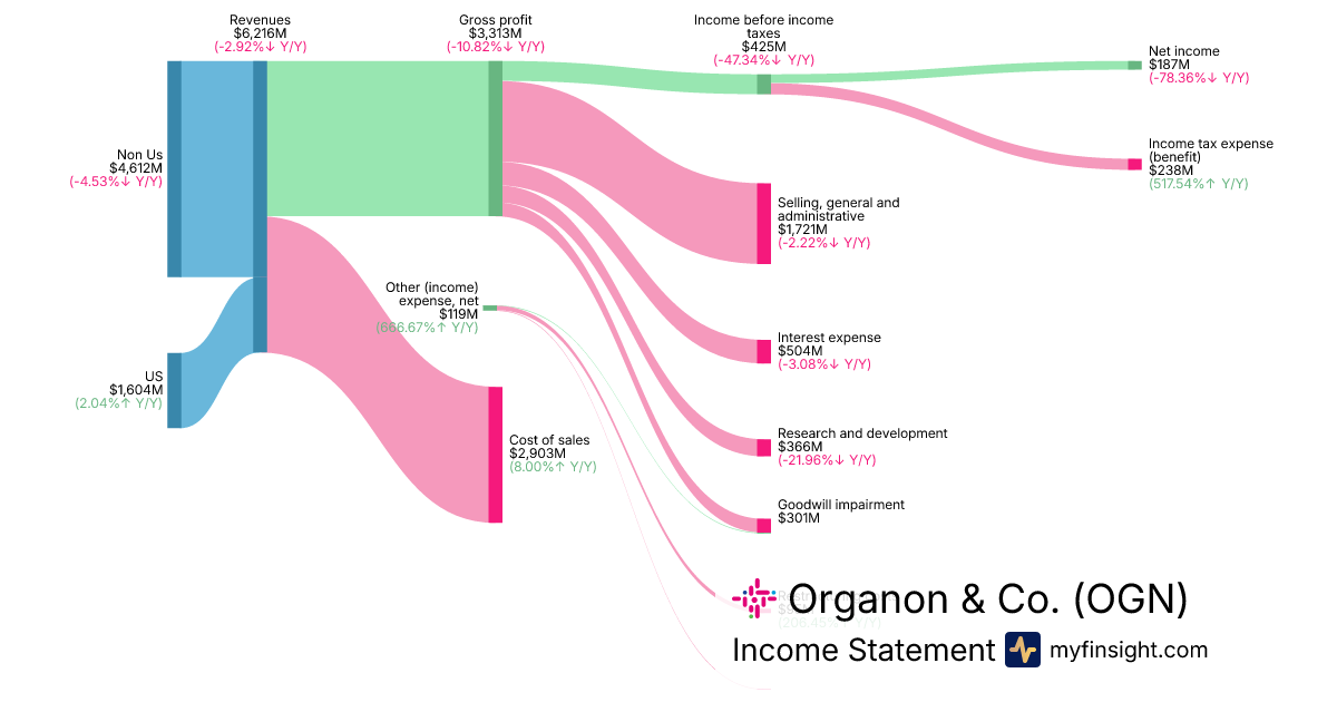 For the year ending 2025-12-31, OGN made $6,216M in revenue. $187M in net income. Net profit margin of 3.01%.
