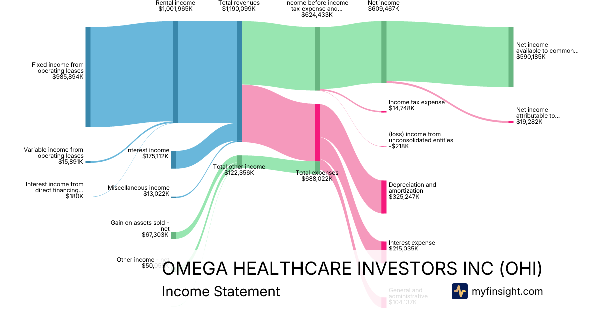 For the year ending 2025-12-31, OHI made $1,190,099K in revenue. $590,185K in net income. Net profit margin of 49.59%.