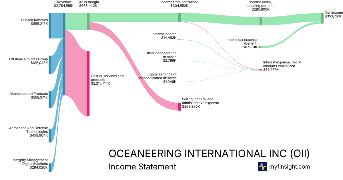 For the year ending 2025-12-31, OII made $2,784,156K in revenue. $353,761K in net income. Net profit margin of 12.71%.
