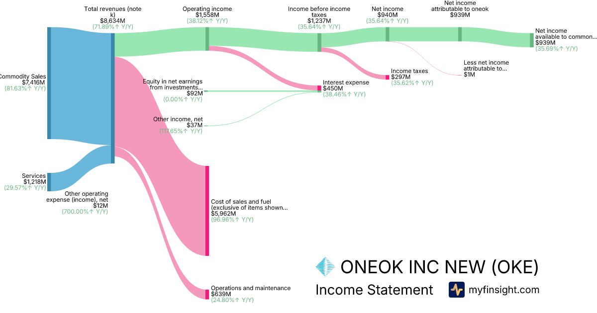 For the quarter ending 2025-09-30, OKE made $8,634M in revenue. $939M in net income. Net profit margin of 10.88%.