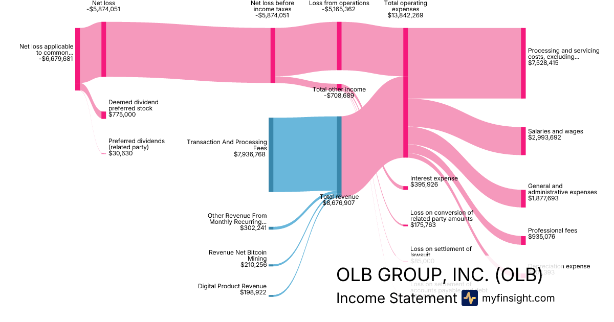 For the year ending 2025-12-31, OLB made $8,676,907 in revenue. -$6,679,681 in net income. Net profit margin of -76.98%.