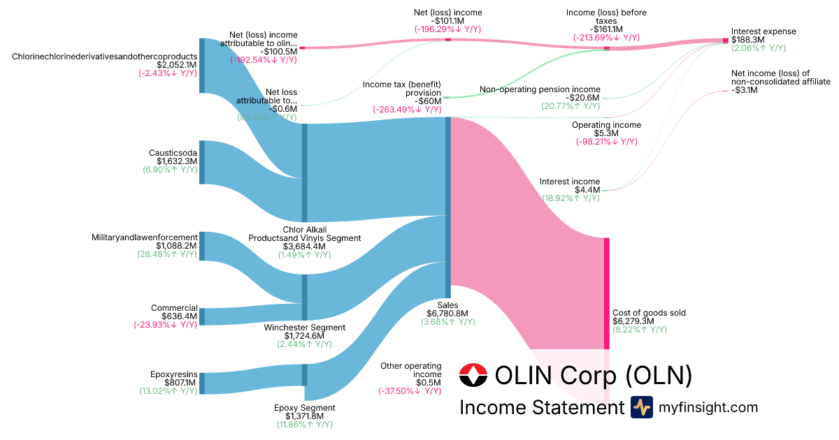 For the year ending 2025-12-31, OLN made $6,780.8M in revenue. -$100.5M in net income. Net profit margin of -1.48%.