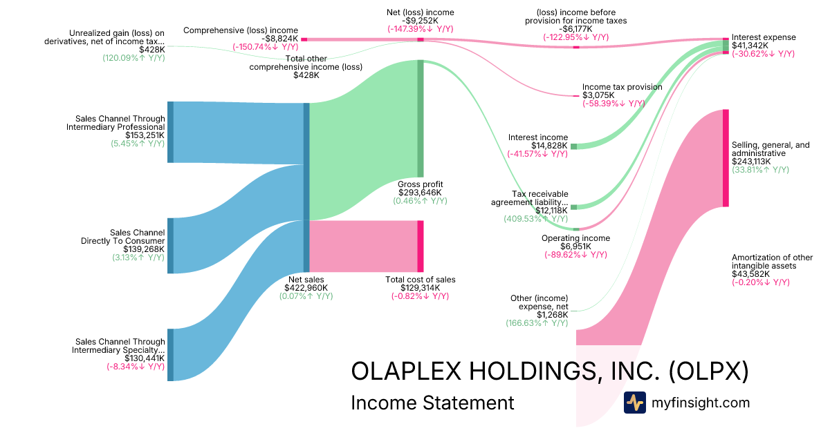 For the year ending 2025-12-31, OLPX made $422,960K in revenue. -$8,824K in net income. Net profit margin of -2.09%.