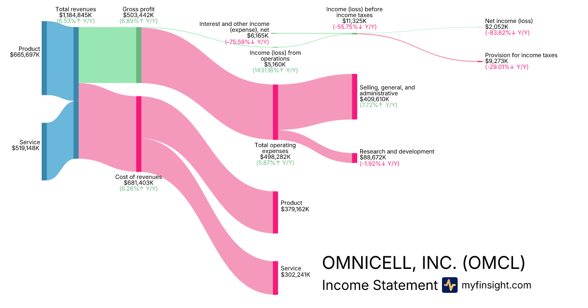 For the year ending 2025-12-31, OMCL made $1,184,845K in revenue. $2,052K in net income. Net profit margin of 0.17%.